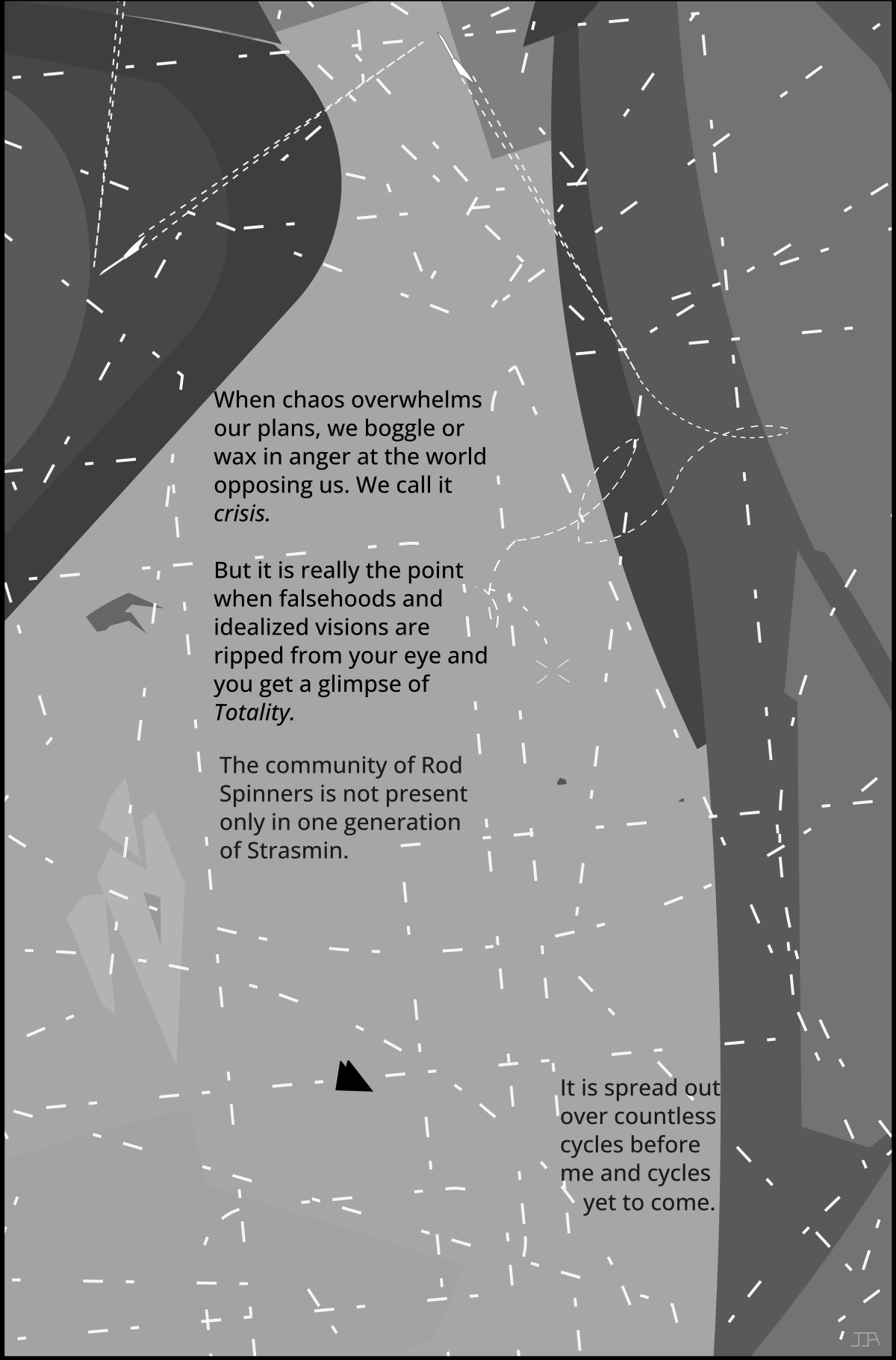 (Yme continues to muse, the scene shows a landscape with the path she has followed, including the crazy trail she made as she chased the creature that took her frenting rod. The ghosts of other paths are seen as well.)